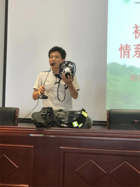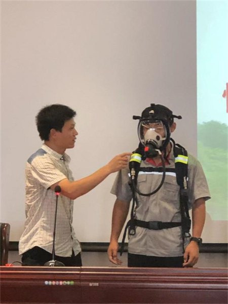 检测评价科主任郗峰通过示范穿脱正压式空气呼吸器,讲解了使用正压空气呼吸器的注意事项,手把手帮助企业职工规范掌握正压式空气呼吸器的使用方法,企业职工认真聆听,积极参与,秩序井然。